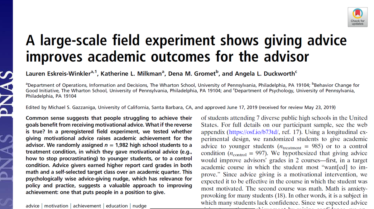 Field experiment (N=1,982) shows when high schoolers spend a few minutes advising peers on how to study, it improves the advisor's OWN grades! Prompting advice-giving is a promising nudge from Eskreis-Winkler to improve achievement