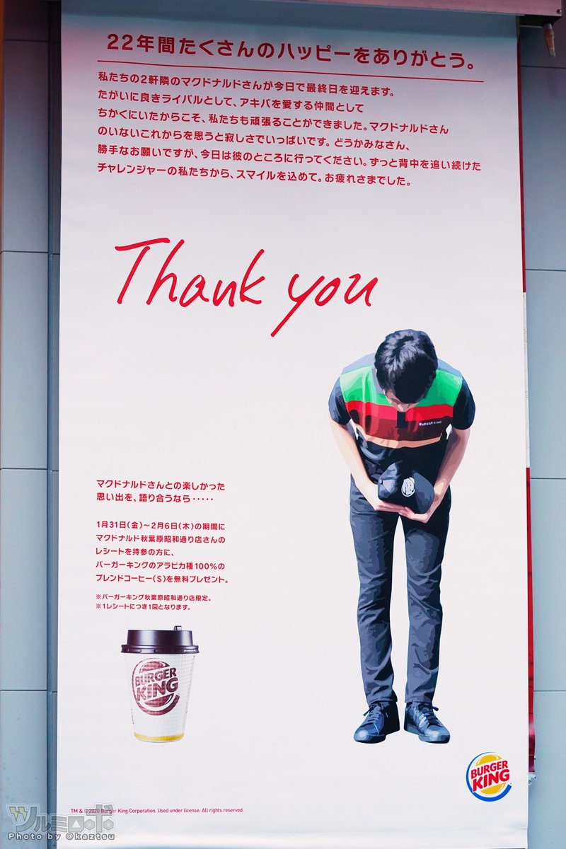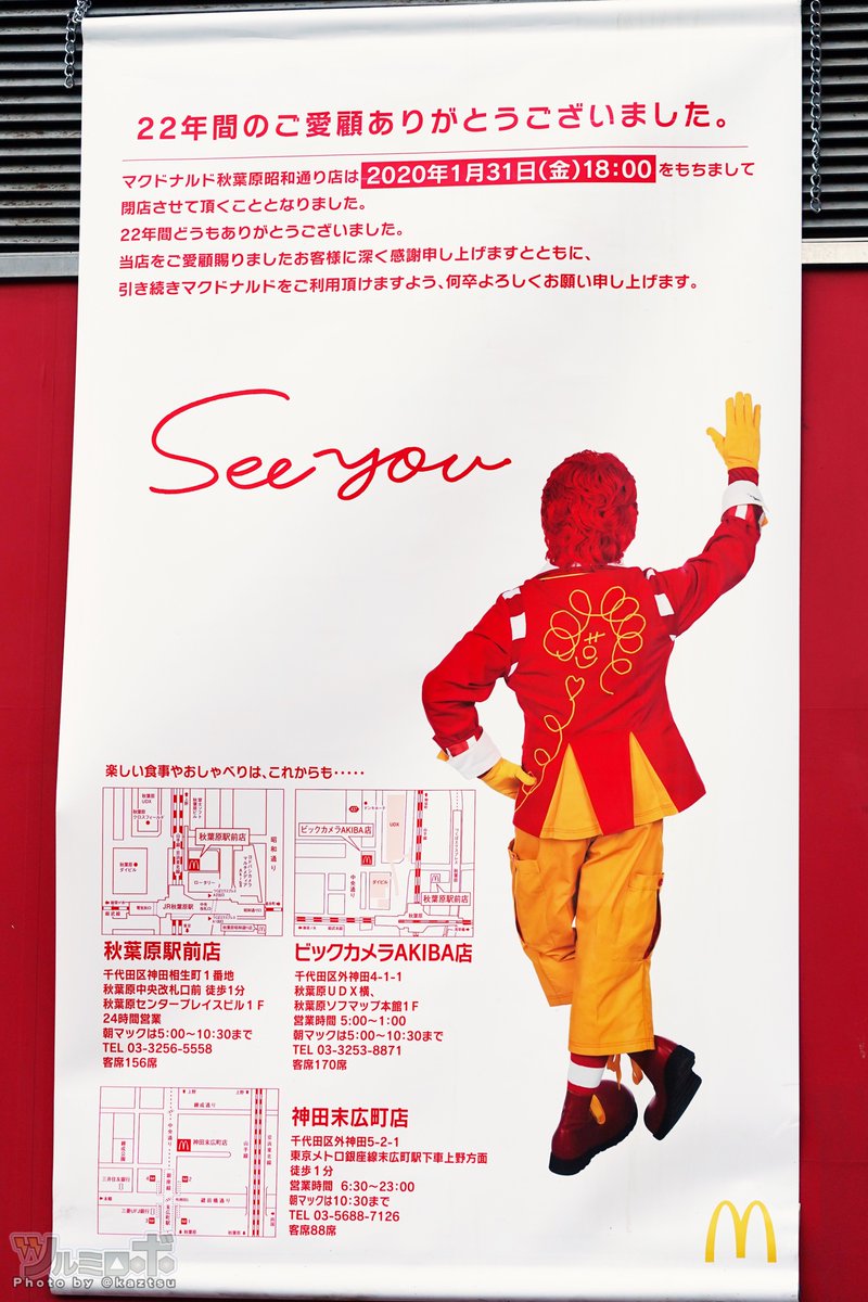 マクドナルド秋葉原昭和通り店、22年間の歴史に幕。きのうあったバーガーキングの「22年間たくさんのハッピーをありがとう」は少なくとも18時過ぎにはなくなっていた。閉店理由はたぶんビルの解体pic.twitter.com/Hgnkeh5h5F