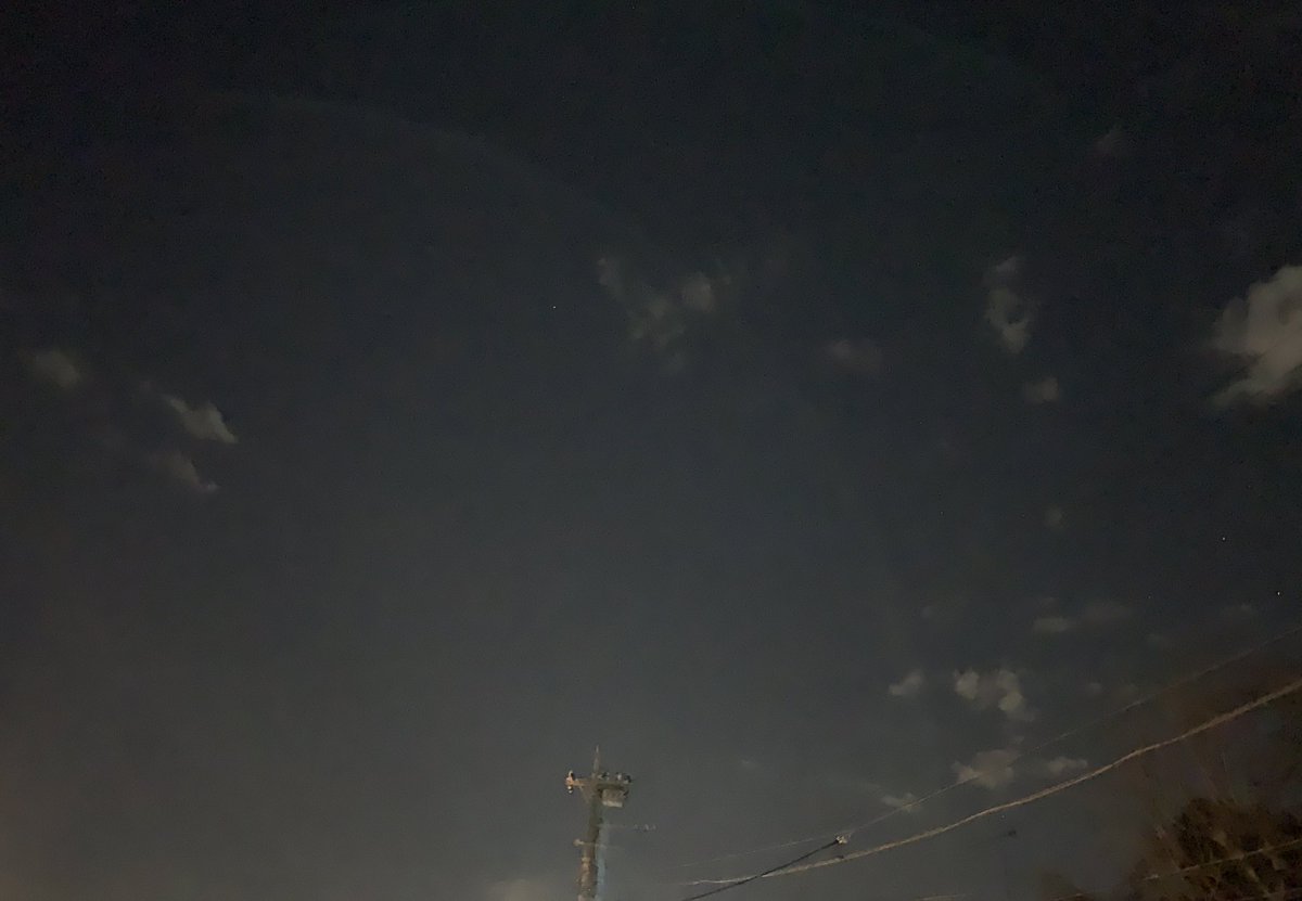 おどろおどろしい木の枝の間から、おぼろ月が見えるです。 段々雲がなくなって星が瞬く夜ですが、今のところ寒くはない。 一応、イマソラ川崎市多摩区。pic.twitter.com/6RgZyLGU1Q