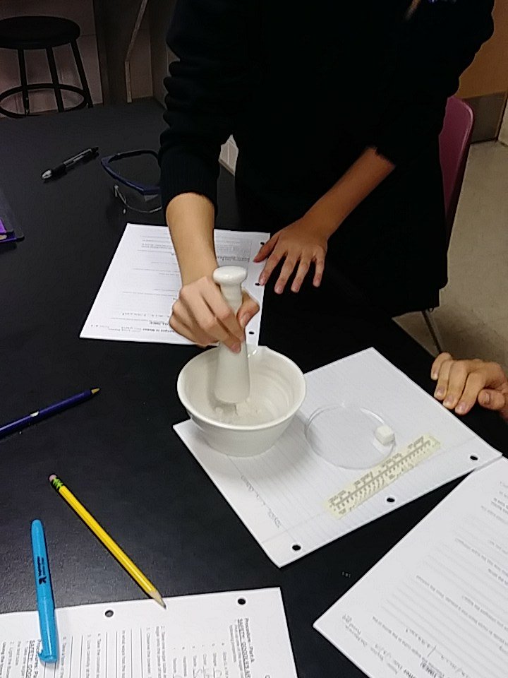 SMLS students testing the physical and chemical properties of sugar. They were shocked how difficult it was to crush.