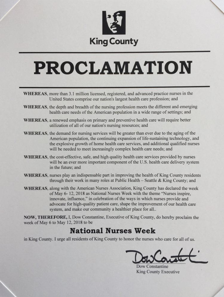 Along with the @ANANursingWorld, @KingCountyWA has declared the week of May 6 – 12, 2018 as #NursesWeek. Thanks to our nurses for providing & advocating for high-quality patient care & making our community a healthier place for all!pic.twitter.com/EOYzBy17d8