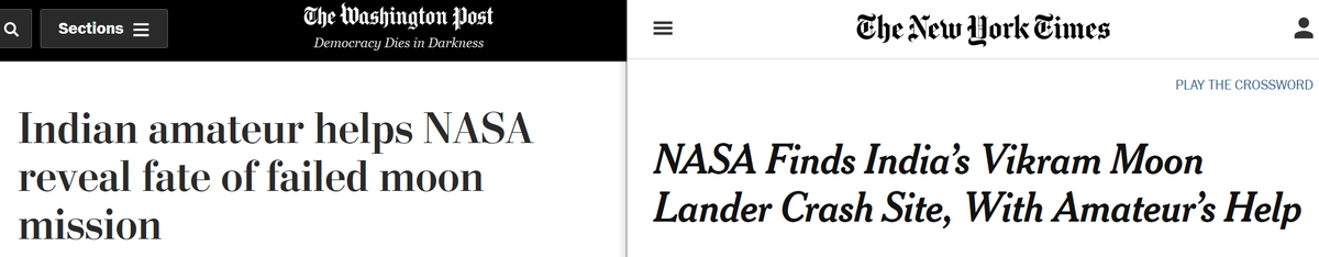This goes out to all the people who scour strange sites on the internet to solve mysteries: An Indian programmer helped NASA find India's lost Vikram moon lander in his spare time. @kchangnyt emailed with @ramanean about his #chandrayaan2 discovery:https://www.nytimes.com/2019/12/02/science/india-moon-mission-vikram-lander-found.html …