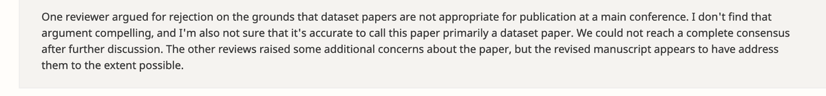 I'm grateful to this meta-reviewer for keeping it real. Obviously, I am biased as an author and glad for the decision, but it's this passage in particular, where the AC dismissed a particularly wrong-headed complaint that gives me confidence that some ACs out there care and read.pic.twitter.com/LB7Or08Gwc
