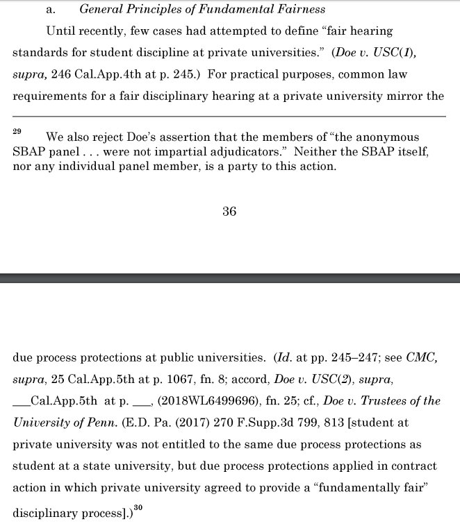 Very interesting holding by Cal. appellate panel in USC case: "Common law requirements for a fair disciplinary proceeding at a private university mirror the due process protections at public universities." This is similar reasoning to the Brandeis court at the federal level.pic.twitter.com/qxgnt4AiHK