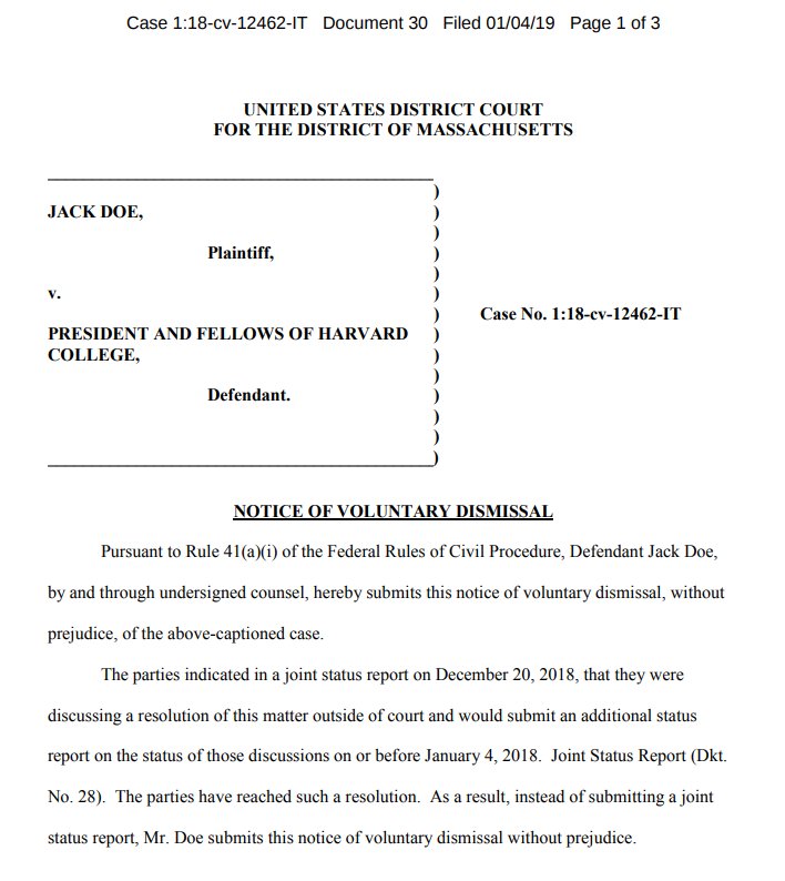 @Harvard due process lawsuit (case involving off-campus incident w/non-student) ends after two sides reach a "resolution."pic.twitter.com/4oB6Whl5FE