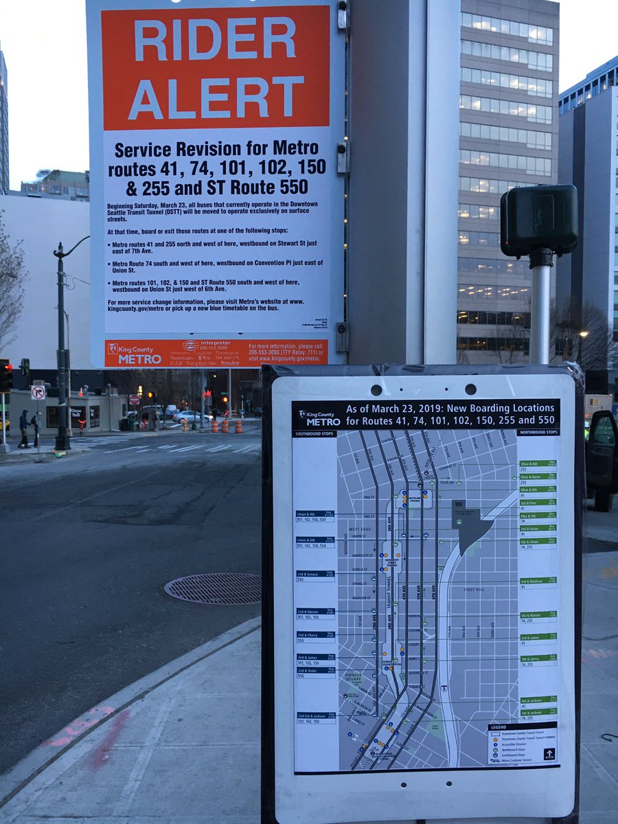 Helping you through the #SeattleSqueeze, Metro's Bill and SDOT's Christine are street teaming near Convention Place and helping customers find their new stops for former tunnel routes (41, 74, 101, 102, 150, 255 and 550). #MoreMetro #Teamwork 😍🚌 https://kingcounty.gov/depts/transportation/metro/schedules-maps/service-change.aspx …pic.twitter.com/M4A1l8Ixas