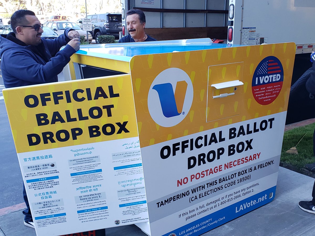 Each voting center will also have a designated box where you can drop off your sealed mail-in ballot. Here’s what they look like:https://twitter.com/LACountyRRCC/status/1224465204773130240 …