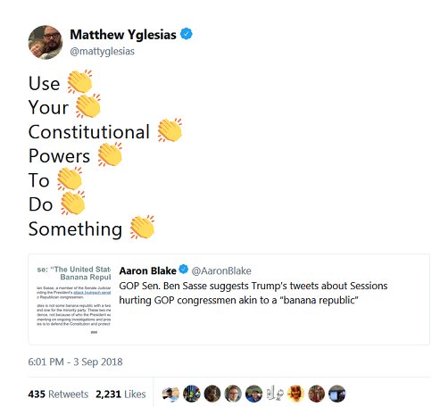 @BenSasse – "Use Your Constitutional Powers To Do Something" ME: Constitutional Powers per Article I, Sec 2, cl 6: "The House of Representatives [...] shall have the sole Power of Impeachment." ME2:@BenSasse is a member of the Senate. ME3: