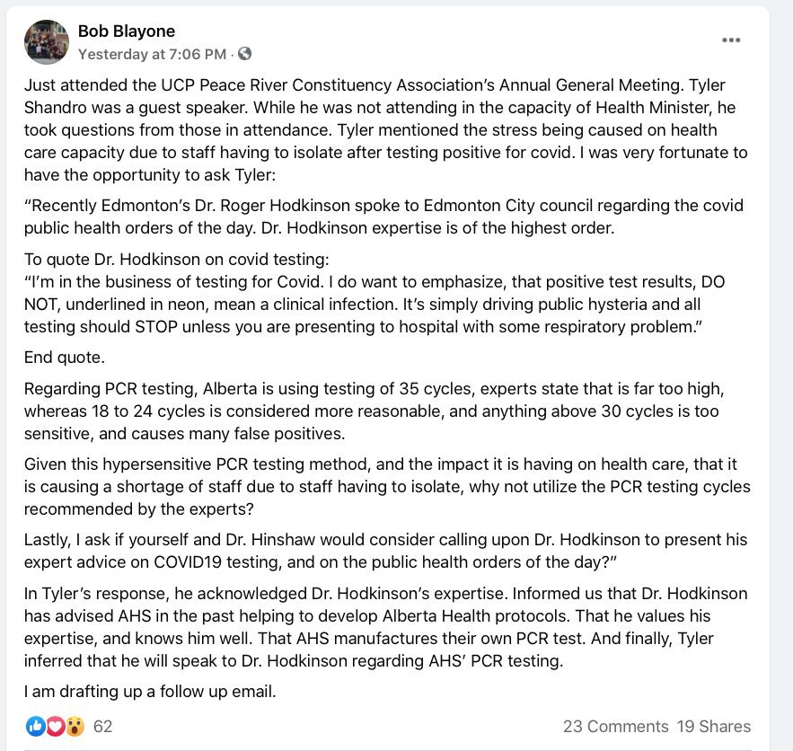 This screencap is more damning. The discredited quack Hodkinson believes testing drives public hysteria and masks are useless. Health Minister Shandro thinks the burden on our system is caused by staff having to isolate after testing positive. And not say his inept bungling.pic.twitter.com/iuGvD5sUEV