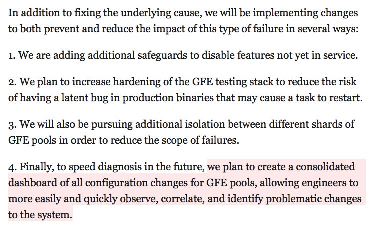 The postmortem for yesterday's GCP outage is up. https://status.cloud.google.com/incident/cloud-networking/18012 … Root Cause - a bug in a feature that had been "dark launched" triggered by a config change Action items: - safer feature flagging/dark launches - config changes need to be canaried and gradually rolled outpic.twitter.com/xHj0lt9WtM