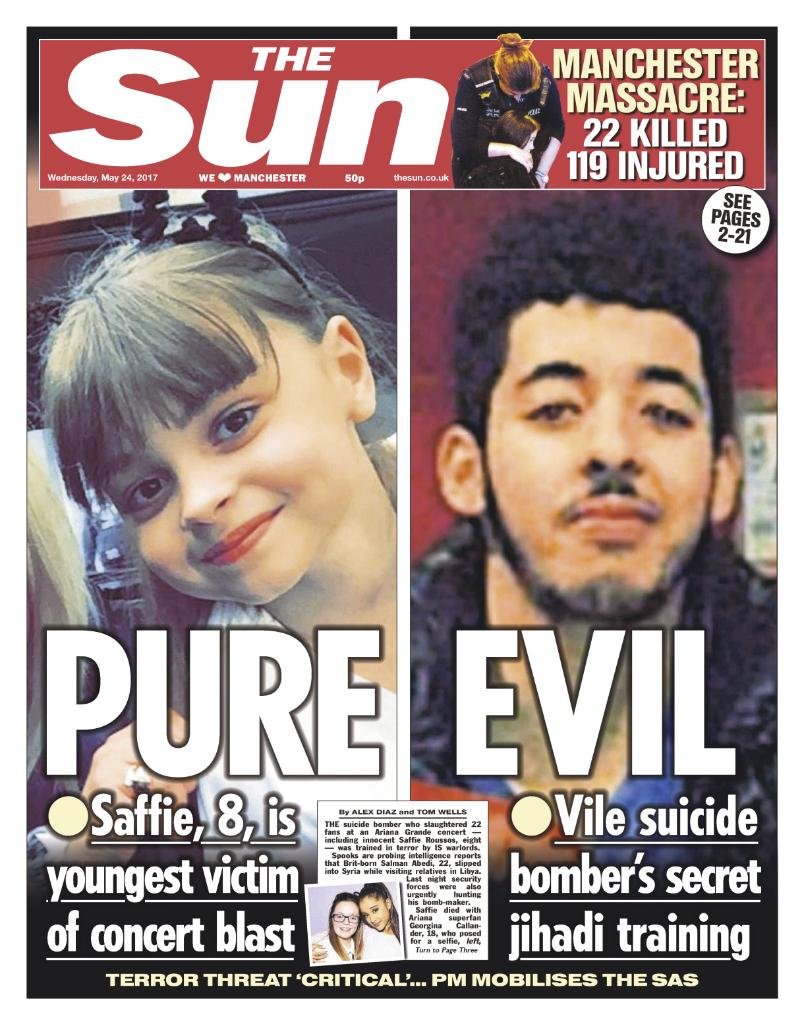 La Une du Sun britannique résume tout. Une petite fille, la sortie de sa vie. Vie volée par 1 fanatique à qui avait été promis le Paradispic.twitter.com/8np6dkZbiy
