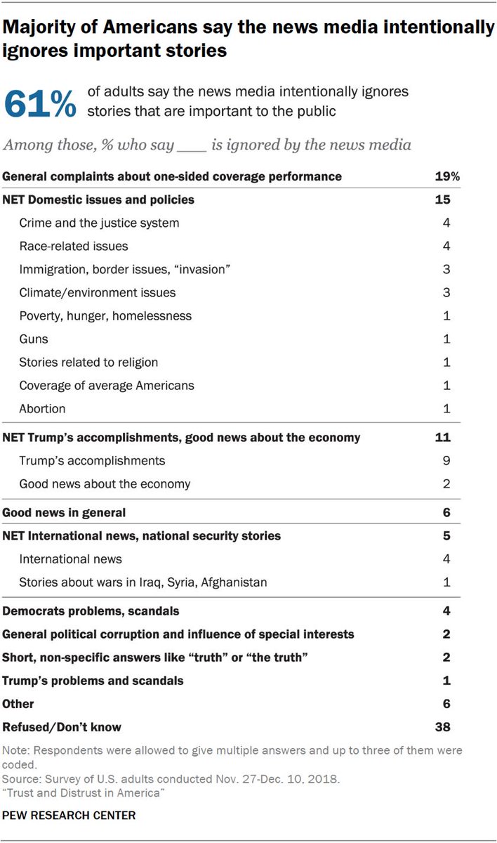 61% of adults say the news media intentionally ignores stories that are important to the public. https://pewrsr.ch/2YidGwy pic.twitter.com/TpWqwfDsf9