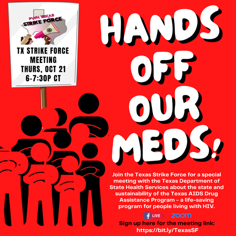Join the Texas Strike Force in ONE hour for a special meeting with the Texas Department of State Health Services Thursday, October 21st at 6p CT. Sign up here for the meeting link: https://bit.ly/TexasSF . Or, stream live on Facebook at Positive Women’s Network USA.pic.twitter.com/qARqoGDItX
