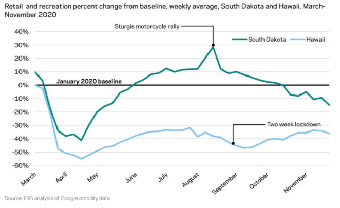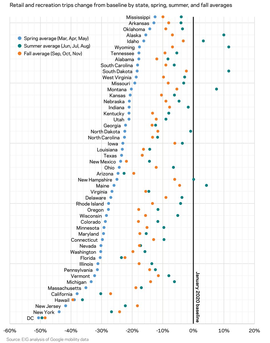 The average number of trips to retail and recreation businesses was 9.5 percent below a January baseline for the typical state in the summer, but dropped to 14.2 percent in the fall, and in just November the average was 18.7 percent below baseline.pic.twitter.com/jZIHx8eJdc