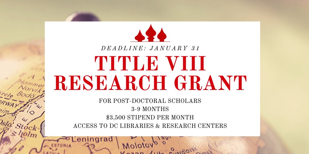 GRANT OPPORTUNITY: For those focusing their research on Russia/Eurasia, we are offering 3-9 month Title 8 Research Fellowships! Eligibility limited to post-docs, stipends and research facilities available! Apply by JAN. 31👉https://buff.ly/2u6rmxk pic.twitter.com/WZ8I8aWyhb