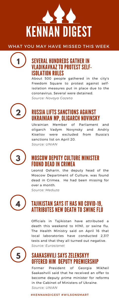 Catch up on the latest news for this week's #KennanDigest! #WilsonSmart 📣 @novayagazeta on Russian protests 💲 @unian_en on sanctions ☠️ @meduzaproject on death of L. Osharin 🦠 @EurasiaNet on #COVID19 in Tajikistan 🇬🇪 @InterfaxUkr on Saakashvilipic.twitter.com/YiBtJG11nW