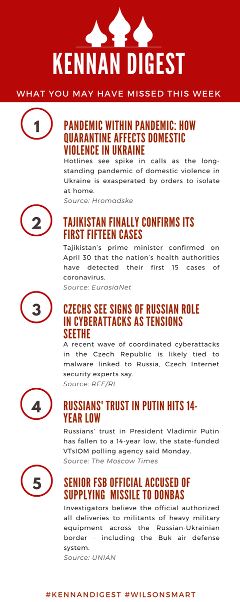 Here is what you may have missed this week in the latest #KennanDigest! #WilsonSmart 🚺 @HromadskeUA on domestic violence in Ukraine 🦠 @EurasiaNet on #COVID19 in Tajikistan 💻 @RFERL on cyberattacks in Czech Republic 🤨 @MoscowTimes on trust in Putin 🚀 @unian on Donbas conflictpic.twitter.com/B7ALdHnncz