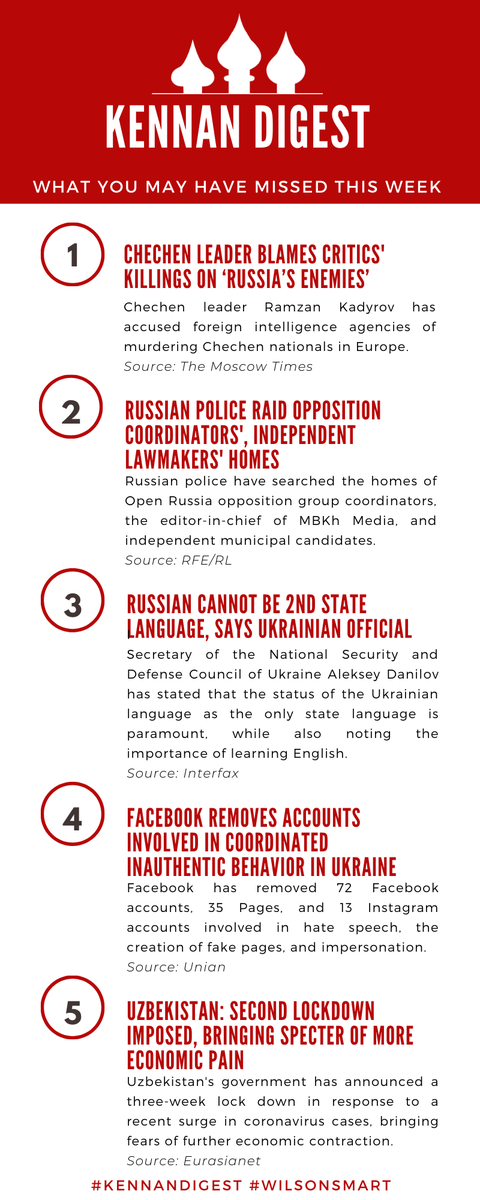 Here is what you may have missed this past week in the Russia/Eurasia region! #KennanDigest #WilsonSmart 👨 Chechen leader @MoscowTimes 📃 Russian police raid @RFERL 💬 on Ukraine language laws @interfaxua 👍 on Facebook accounts @unian_en 🦠 on COVID in Uzbekistan @EurasiaNetpic.twitter.com/qVpxNmjpdA