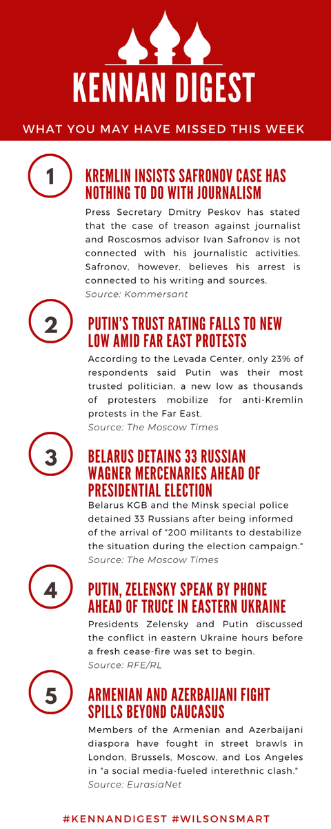 Check out the #KennanDigest for stories you might have missed this week! ⚖️ On the Safronov case @kommersant 📉 On Putin’s trust rating and 🇧🇾 on mercenaries in Belarus @MoscowTimes 📞 On a call b/w Putin & Zelensky @RFERL 🌎 On clashes outside of the Caucasus @EurasiaNetpic.twitter.com/9O3MTeD6Ou