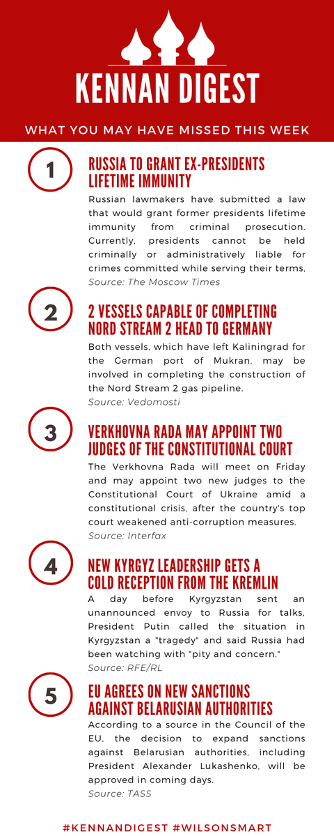 Here are the latest developments in the #Eurasia region for the #KennanDigest! ⚖️ on Russia's immunity law ⛴️ on Nordstream 2 📜 on Ukraine's Constitutional Court 🇰🇬 on new Kyrgyz leadership 💶 on new EU sanctions @MoscowTimes @Vedomosti @interfaxua @RFERL @tass_agencypic.twitter.com/kDWumeetcp