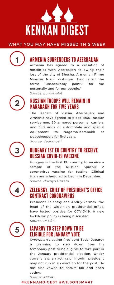 Here are some of the latest headlines in this week's #KennanDigest! 🇦🇲 🇦🇿 on Nagorno-Karabakh 🪖 on Russian troops 💉 on a COVID-19 vaccine 😷 on Zelensky contracting COVID-19 🗳️ on Kyrgyz elections @EurasiaNet @Vedomosti @novaya_gazeta @RFERL Click 👇 to expand!pic.twitter.com/5hh6t1RelT