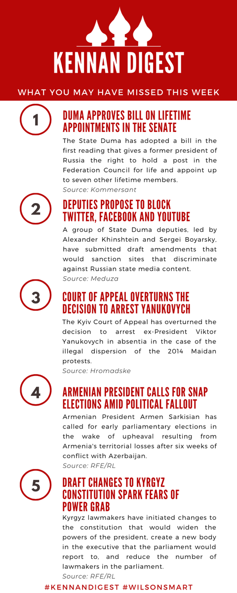 Here are some stories you may have missed in the #Eurasia region for this week's #KennanDigest! 📜 on a Duma bill 📱 on Russian state media ⛓️ on Yanukovych 🗳️ on Armenian snap elections ✏️ on Kyrgyz constitution Articles from @kommersant @meduzaproject @Hromadske @RFERL!pic.twitter.com/VYJzfvqtl3