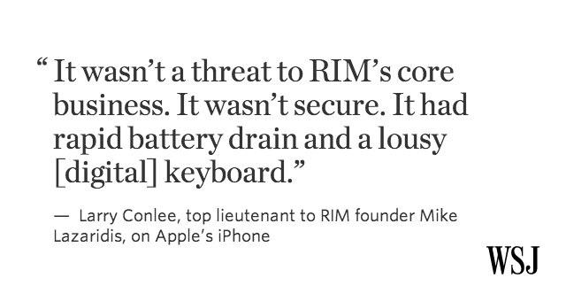 An inside look at why BlackBerry wasn't initially worried about the iPhone: http://on.wsj.com/1Ka4cmo pic.twitter.com/Tj1SZOBq90