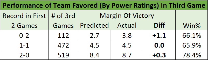 Great question. Over the last 5 years we have 1103 "3rd games" in our database. Looking at the performance of the teams favored by our power ratings in the 3rd game, split by their record in the first two games ... It looks like *mostly* a myth. https://twitter.com/ryancoleman_98/status/1222974761082351616 …pic.twitter.com/OVmhdeZs1p