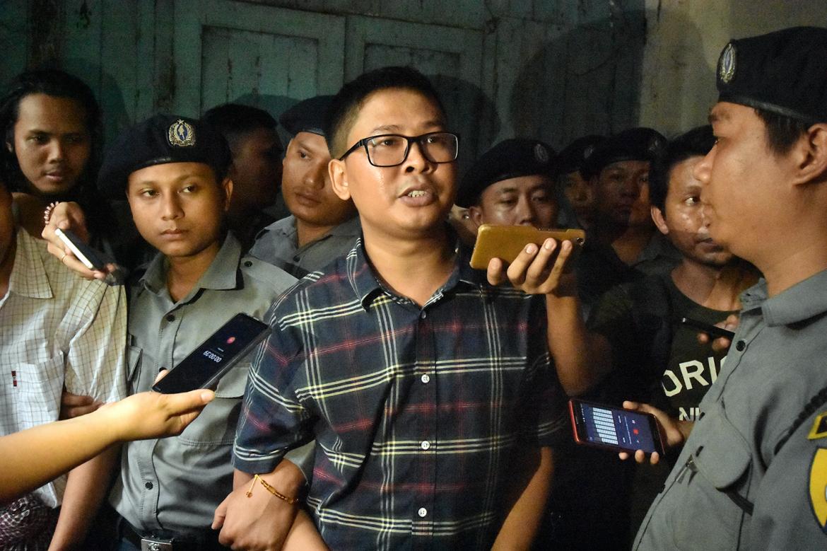 What do two Reuters journalists get for exposing Myanmar army's execution of ten Rohingya men? Being hooded, deprived of sleep, and charged with "crime" that could get them 14 years in prison. Thanks, Aung San Suu Kyi and your government. http://bit.ly/2zOr1l5 pic.twitter.com/7N5G4eMWr1