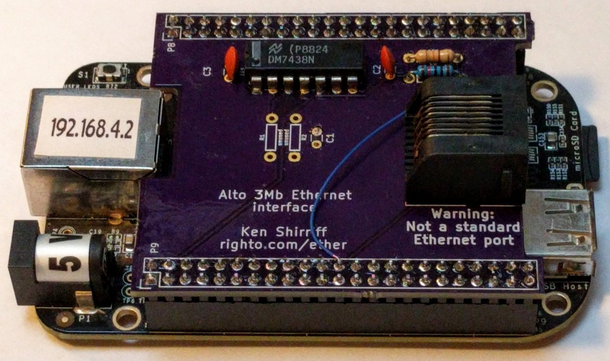 #BeagleBone to connect the Alto's Ethernet to the outside world. http://www.righto.com/2018/01/xerox-altos-3-mbs-ethernet-building.html …pic.twitter.com/ERjyebURWR