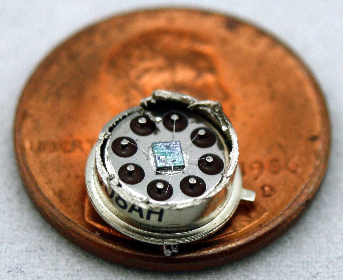 Not my most successful decap: tried to knock the lid off this CD4015 shift register chip from the 1970s with a chisel and the chip snapped in half. The round lid looks cool but doesn't come off cleanly like square ones. I put the pieces together to get a partial die photo.pic.twitter.com/iqYifoqgi3