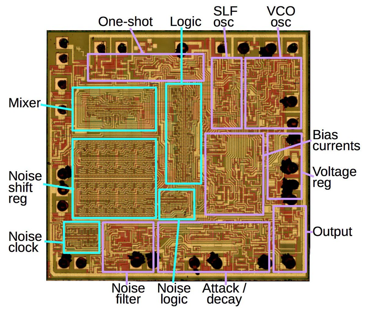 The TI 76477 sound chip was popular with hobbyists in the late 1970s and used in Space Invaders. I reverse engineered it from die photos and explain how it works. It uses unusual digital logic called I2L, much denser than TTL. Details in my blog post. http://www.righto.com/2018/05/inside-76477-space-invaders-sound.html …pic.twitter.com/pfSKdQrYzT