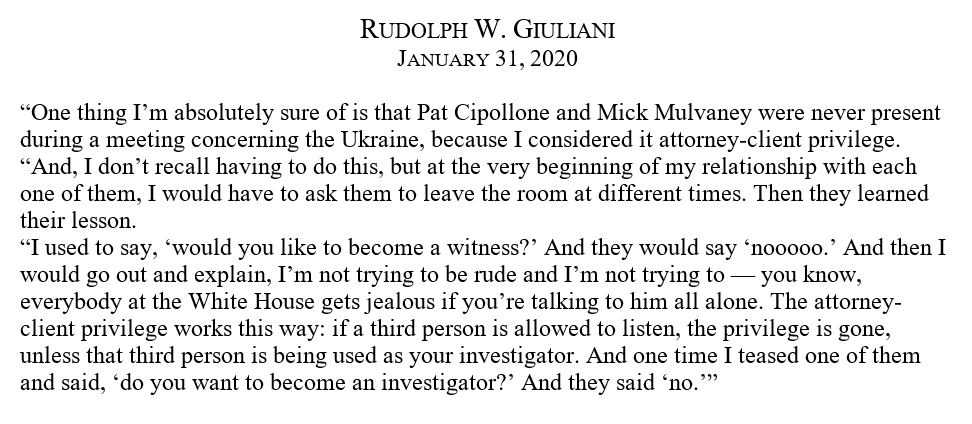 There are legal consequences to BOLTON's claim he discussed Ukraine in a mtg with TRUMP, RUDY, MULVANEY & CIPOLLONE. It could breach Trump-Giuliani atty-client privilege, meaning