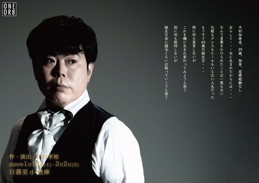 ONEOR8公演 「誕生の日」 1月27日(月) 本日9日目! 13:30開場 14:00開演 18:30開場 19:00開演 の2ステージです。 当日券、マチネ若干枚ご用意できます。ソワレたくさんご用意できます