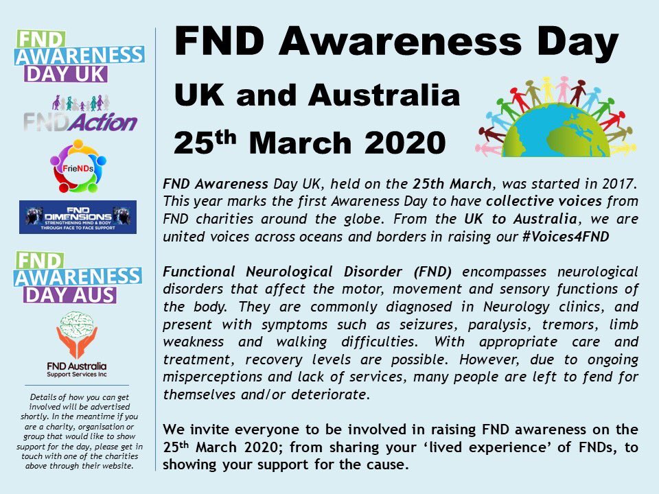 @FNDAus is delighted to be partnering with@FNDAction,@FNDDimensions and@fndfriends in the Australia and UK FND awareness day on the 25th March 2020. Details of what we'll be doing, and how you can get involved, will be shared shortly.#Voices4FNDpic.twitter.com/sr23yxg4Y7