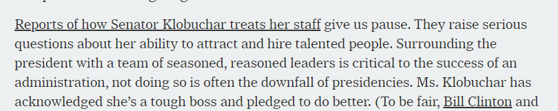 this is also an incredibly revealing bit, where the part about klobuchar abusing her staff does give the NYT pause, not because abusing her staff is wrong, but because it'll hurt her opportunities to hire strong talentpic.twitter.com/cofMI5B2K1