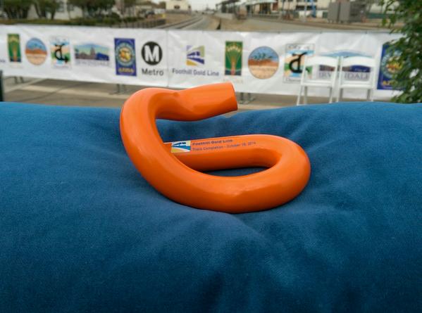 The “gold spike” for the Gold Line extension - getting ready for ceremony in Azusa