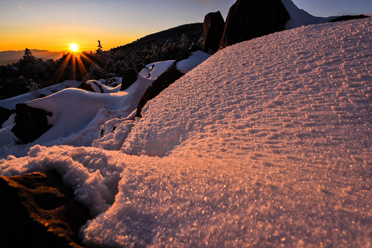 山の上で何度となくご来光や日の入りを見てきたけれど、 その光が目の前の雪を照らすと、その色彩に心奪われてしまった。 2/1夕日と、2/2朝日。