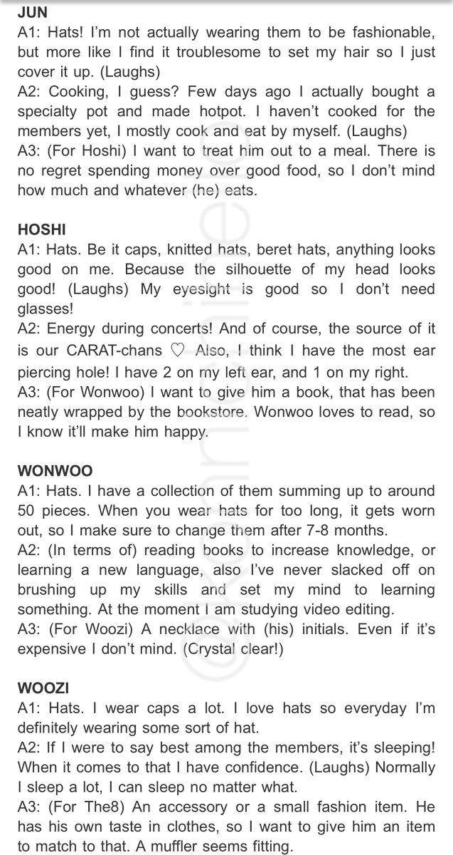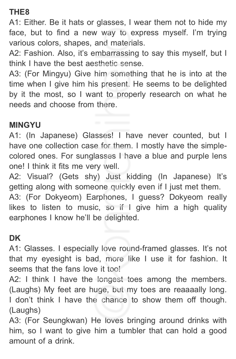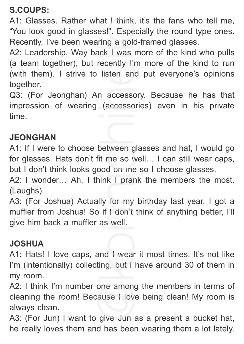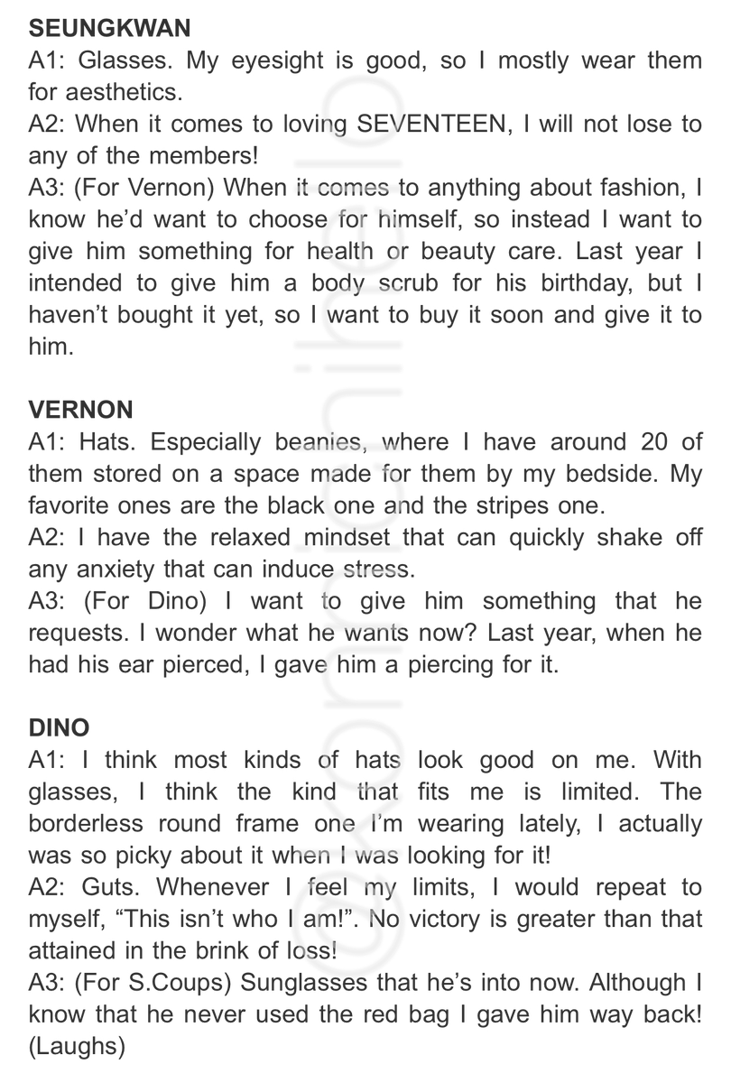 (TRANSLATIONS) SEVENTEEN A/NAN QUESTION Q1: Which fits you better, glasses or hat? Q2: Within SEVENTEEN, what do you think are you best in/at? Q3: For this member, what do you want to give on their birthday? (Sorry, no photos because the official magazine posted restrictions)pic.twitter.com/ywMR36fp6G