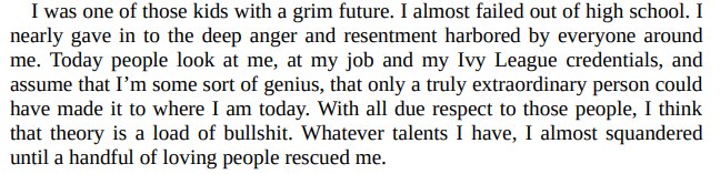 Got that? So the odds are stacked against the guy but it's bullshit that he did anything special. This sets up the book. "Here is this extraordinary thing that I did that I should be seen for doing, and also anyone could do it."