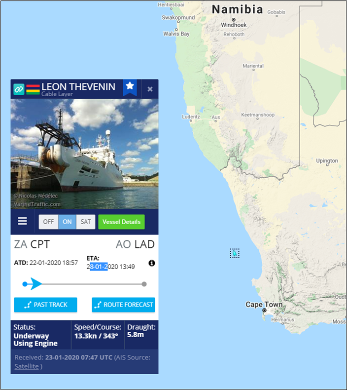 Cable vessel, Leon Thevenin, is off the coast of South Africa approximately just under half the way up to Namibia.pic.twitter.com/PfKAbttCPb