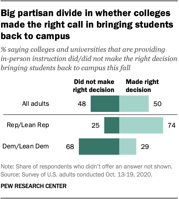 Party divide in views of higher ed persists: Republicans & Democrats are deeply divided over whether colleges made the right call in bringing students back to campus during a pandemic https://pewrsr.ch/2HCVcA0 pic.twitter.com/RfcAinzufW