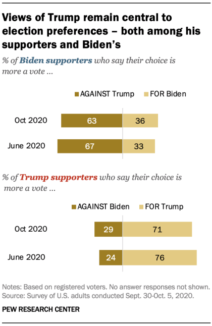With less than a week to go, views of Trump are central to voters' presidential preferences - on both sides. 63% of Biden supporters say their vote is *against* Trump; an even larger share of Trump supporters - 71% - say their vote is *for* him. https://pewrsr.ch/3dbDNdo pic.twitter.com/X0XSeTsG5S
