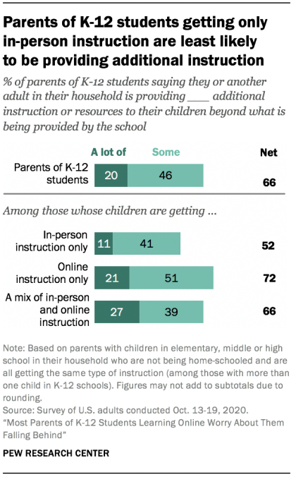 Our new look at K-12 learning during the pandemic finds that most parents whose kids are learning online this fall are providing additional instruction or resources beyond what the schools are providing https://pewrsr.ch/3jG9Wvi pic.twitter.com/YAUVqjcxYN