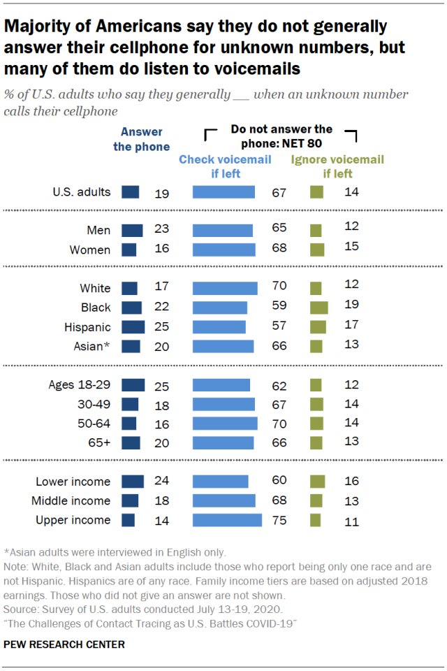 @pewinternet data shows: 19% generally answer the call 67% don't answer and check voicemail 9% don't answer or check VM Big challenge for those running#contacttracing programs https://pewrsr.ch/3ee8QGi pic.twitter.com/k4gLoOWww6