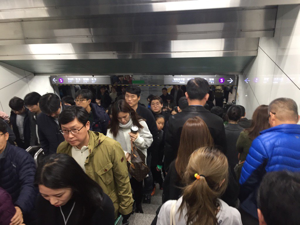 Seoul subway packed with protesters headed to rally against SKorean President Parkpic.twitter.com/f0u3sP1ipR