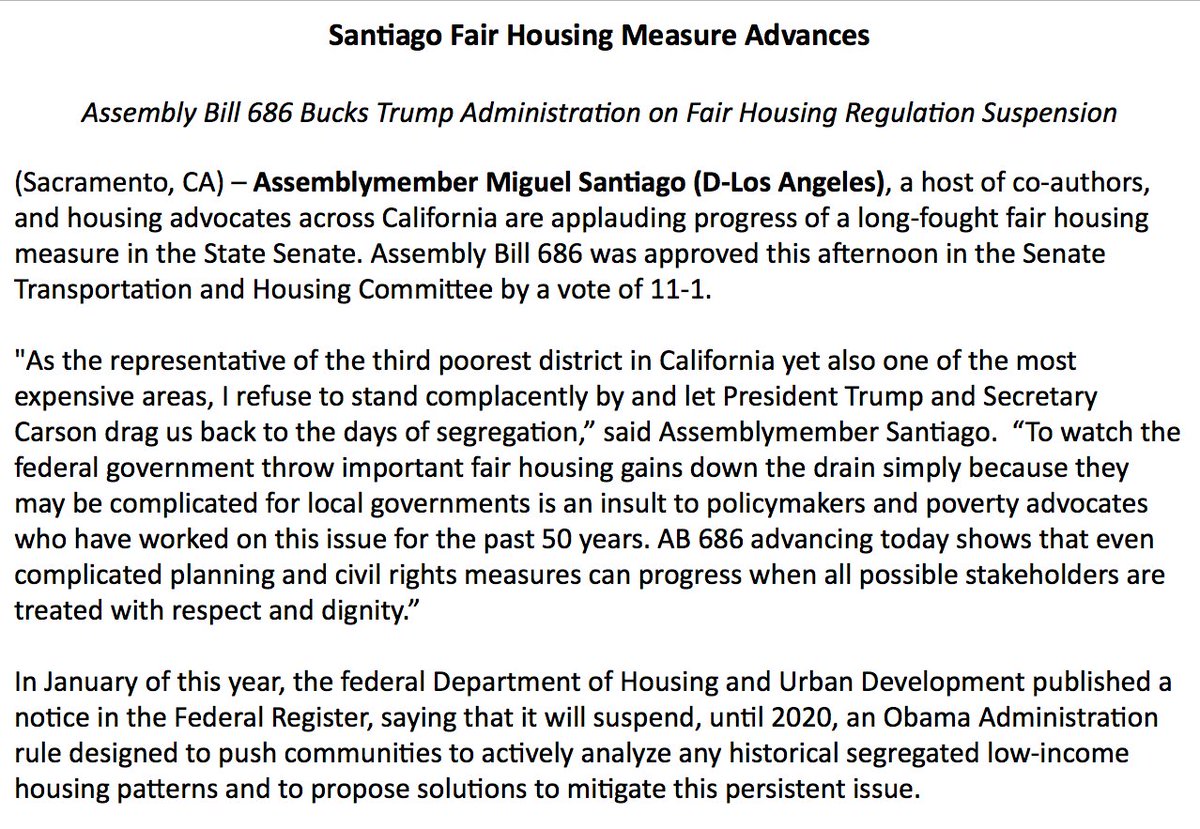 Legislation from @SantiagoAD53 to enshrine into state law federal anti-housing segregation rules targeted by the Trump administration advanced in a Senate committee today. The bill had been on hold for a year.pic.twitter.com/jy8Hf4Dslu