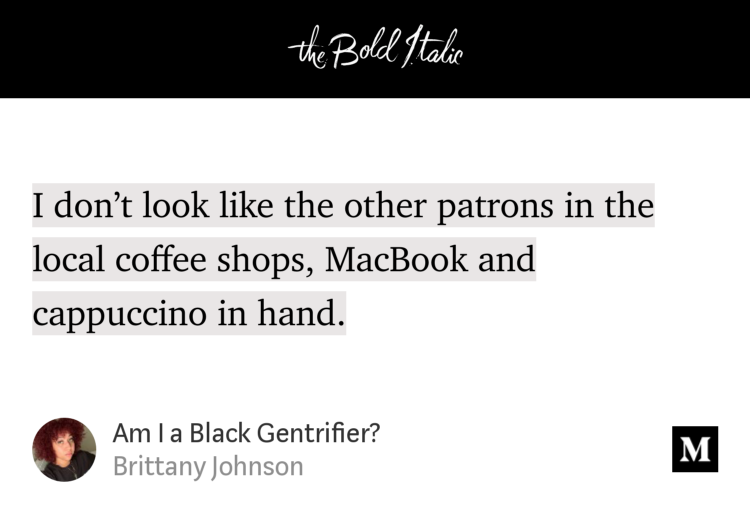 I struggled with this when I was living in historically black East Palo Alto up until last year. Was I economically gentrifying, while recognizing I didn't have the same effect as white people moving to a neighborhood and causing a cascade effect? Tough questions.