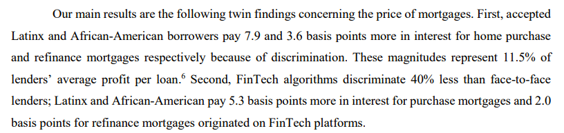 Racial discrimination is rampant in mortgage lending, but fintechs (the Rocket Mortgages of the world) actually discriminate substantially *less* than traditional lenders: https://www.nber.org/papers/w25943.pdf … #NBERDaypic.twitter.com/qPxyMSoJzA
