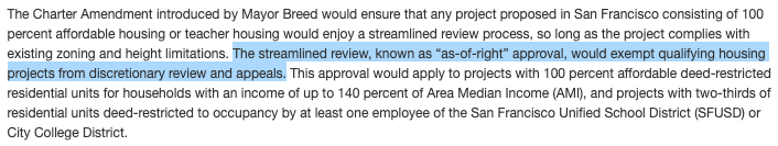 The charter amendment does not remove CEQA or CEQA appeals for shelters but it does for 100% subsidized affordable and teacher housing. https://sfmayor.org/article/mayor-london-breed-introduces-charter-amendment-build-affordable-and-teacher-housing …pic.twitter.com/9jXO3hw44d